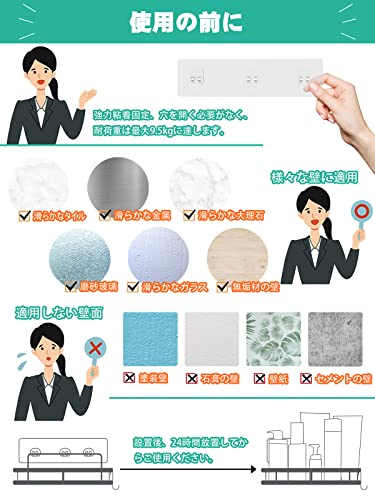 ?【簡単に取り付け】このお風呂ラックは穴を開く必要がなく、強力な粘着テープで適用な壁に貼り付け、そして、浴室ラックをテープの上に掛けるだけです。耐荷重は9.5kgに達し、落ちる心配はありません。詳しいインストール方法は付属の説明書に記載されています。粘着テープは再利用できないことにご注意してください。(予備のテープ1枚付き)
