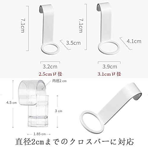 パッケージの内容:合計12個のフック: 4枚入内径2.5cm吊り下げラック+4枚入内径3.1cm吊り下げラック+4枚入4.51.85cmフッククリップ、カラー:ホワイト。注:フックを掛けるクロスバーの直径は2cm以下にしてください。
