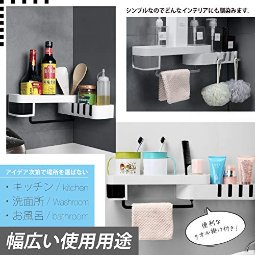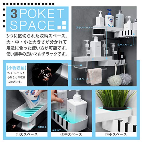 ?【??悩みが一気に解決??】浴室のシャンプーやボディーソープ、お風呂掃除用の洗剤やスポンジなどの置き場所に悩んでいませんか?当製品は『3つのスペース』でそれぞれの大きさに収納、『角度の調整』で様々な場所に設置、『便利なフックとタオル掛け』で細かい物も引っ掛けられ収納にとても便利です♪