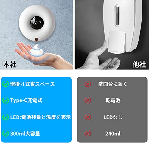 【USB充電式】Type-C充電式で、容量1200mAhのバッテリーを内蔵しています。完全充電には約3時間かかり、1回の充電で約45日間使用できます、長時間スタンバイ。(ご注意:充電器を使用して充電する場合は、ディスペンサー本体を傷つけないために、5V/1Aの充電器を使用してください。)【取り付け簡単】器具上の蓋を開けて洗剤を入れます。コンセントが必要ないため、置