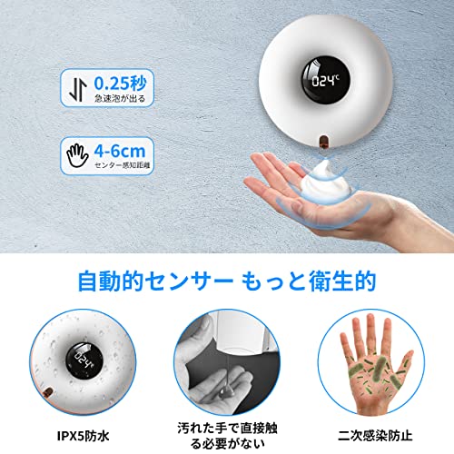 【ドーナツ型オートディスペンサー】非接触式自動ソープディスペンサーは最先進の高感度赤外線センサーが搭載するため、吐出口の5cm以内の感知距離で、手をかざすだけて、自動的にソープが出てきます。ノータッチ式で、手と泡も本体に接触なし、二次汚染を避けて、子供と高齢者も快適に使用できます。