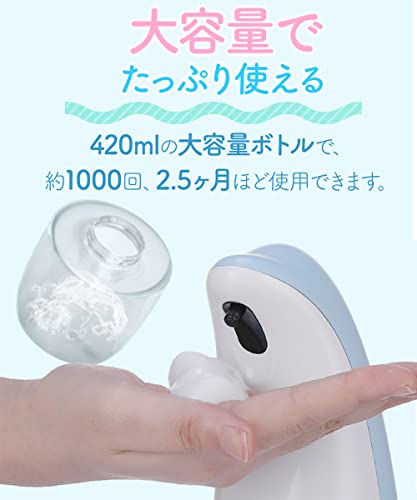 【コードレス&420ml容量】電池式でコンセントが必要ないため置き場所を選ばず、台所にも洗面所にも設置できます。 420mlの大容量ボトルで、約1050回使うことができます。 人数の多い場所でもすぐになくなることがなく、大