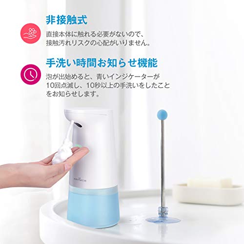 ?【ボトルやポンプに触れない、だから衛生的&泡立ち豊富】手をかざすとセンサーが反応し、自動的に泡が出ます。最初から泡で出てくるので自分で泡だてることが苦手なお子様にも。また、洗う前の汚れた手であちこち触らないで済むので、本体も清潔に保つことができます。泡が出始めると、青いインジケーターが10回点滅し、10秒以上の手洗いをしたことをお知らせします。風邪などの流行時期にもしっかりきれいにすることがで