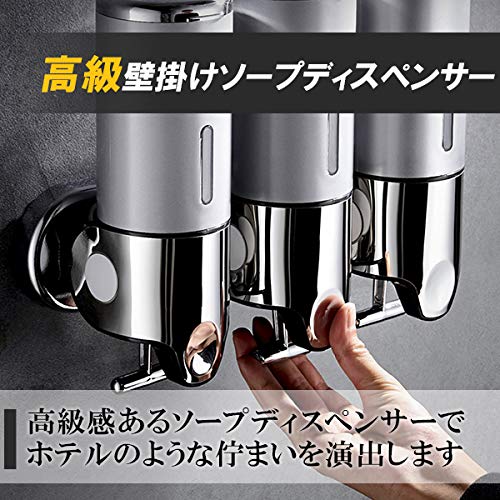 高級感あるソープディスペンサーでホテルのような佇まい:ステンレス製のシンプルかつスタイリッシュなソープディスペンサーです。3連タイプなので、バスルームで必要なシャンプー、コンディショナー、ボディーソープをすべて一か所に収納することができ、場所も取りません。床面などに直置きしなくて良いのでカビの原因にもならず清潔です。