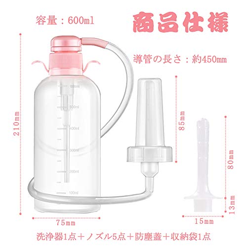 【商品内容】:洗浄器1点+替ノズル5点+防塵蓋+収納袋1点、合計8点セットとなります。洗浄器:全長は約210mmで、幅は約75mm、容量は600mlです。ノズルの長さは約80mm、ノズル用の防塵蓋の長さは約85mmで、導管の長さは約450mmです。五つの替ノズルはがついていて、衛生のため、ノズルを定期的に新しく替えてください。