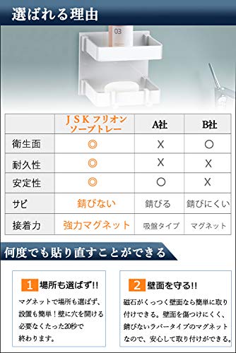 【こだわり】様々なメーカーから”吸盤タイプ ソープトレー”や”竹タイプ ソープトレー ”が販売されていますが、JSK フリオンのソープトレーは”デザイン”と”耐久性能”が一味違います。ソープトレー系を取り扱っている20社以上の工場からサンプルを取り寄せ、ISO 9001国際品質基準をクリアしている選りすぐりの1社でのみ製造を行なっております。