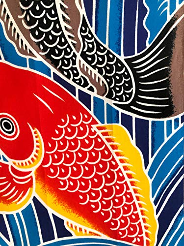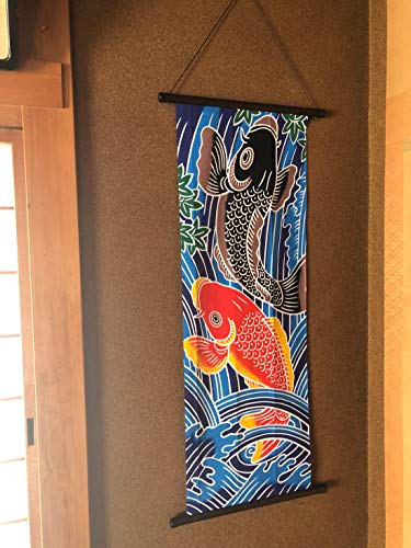 7色のそれぞれの色型を使い1色1色手染めで職人の手間と心をこもった作品です。伝統的で縁起の良い鯉の滝登り絵柄です。出世や運気上昇の意味が込められていると昔から言われております。玄関、和室、床の間、洋室、廊下 など様々なシーンに飾ってお使いください。