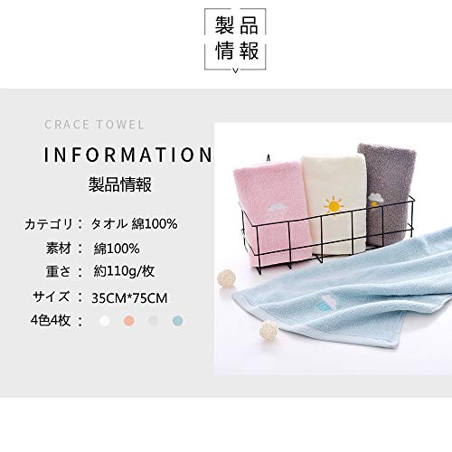 【タオル 4色4枚セット】素材:綿100%、サイズ目安:約35×75cm、重さ:約100g/枚、ふんわりとした肌触り シンプルなデザイン。