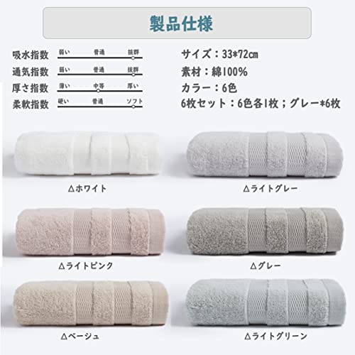 【フェイスタオル 6枚セット】素材:綿100% 、サイズ:約33x72cm 、重量:1枚あたり 約80g 、セット内容:グレー6枚。