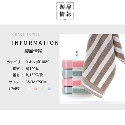 【タオル 3色4枚セット】素材:綿100%、サイズ目安:約35×75cm、重さ:約130g/枚、ふんわりとした肌触り シンプルなデザイン。