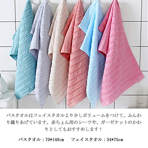 【タオル仕様】素材:綿100%/ガーゼ(綿紗)織り&無撚糸、フェイスタオル&バスタオルの2つのサイズをご用意。フェイスタオルサイズ:約34×75cm 、重さ:1枚あたり 約65g 、5枚入/1枚入。バスタオルサイズ:約70x140cm、重さ:215g、1枚入。