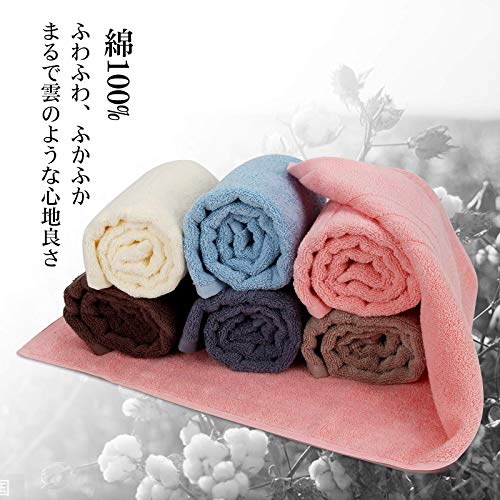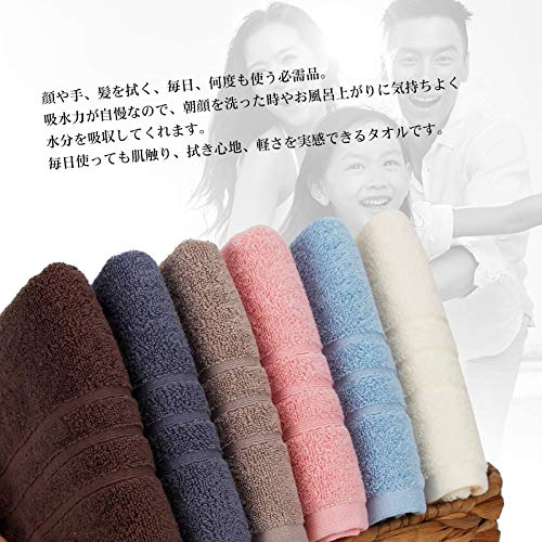 【フェイスタオル6枚セット】素材:綿100%。製品サイズ:約33cm×75cm。製品重量:約100g(1枚あたり)。内容:6枚セット。カラー:ピンク、ホワイト、ブルー、ブラウン、グレー、コーヒー(各色1枚ずつ)。ご使用について:使い始めはやや毛羽があり、ご購入後1~2回水通しをお願い致します。2回目あたりから毛羽落ちが軽減されます。