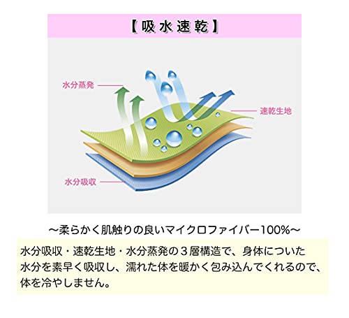 吸水速乾 柔らかく肌触りの良いマイクロファイバー100%。 水分吸収・速乾生地・水分蒸発の3層構造で、身体についた水分を素早く吸収し、濡れた体を暖かく包み込んでくれるので、体を冷やしません。