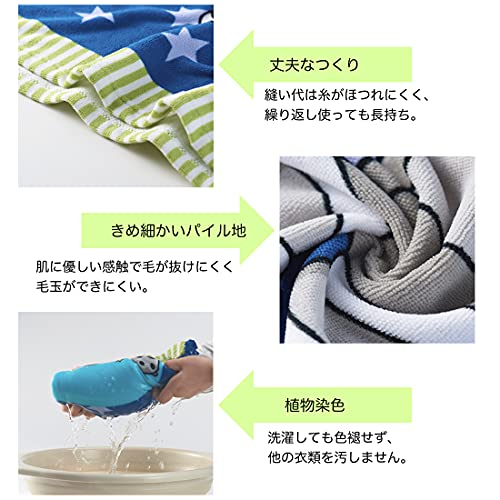 安全への配慮 蛍光剤・ホルムアルデヒド不使用、無臭、植物由来の色落ちしない染料で、お子様が口にくわえても安心できるクオリティー。