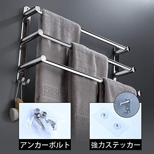 ステンレス製タオルハンガー 三段式 タオル掛け 強力3M 粘着 バスルーム用 壁掛け式 穴なし取り付け 穴あけ取