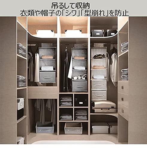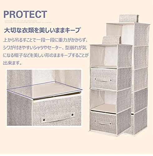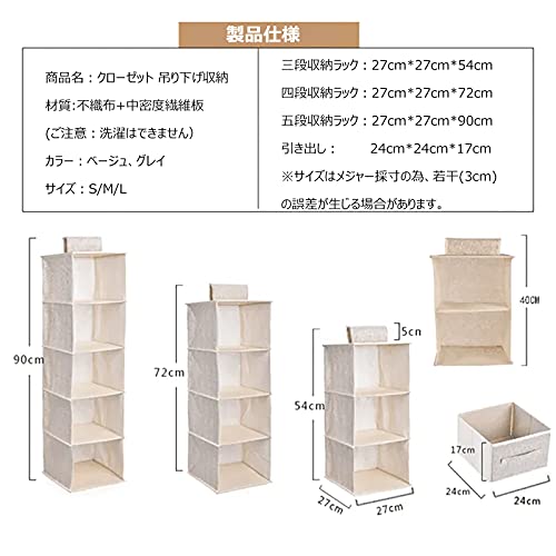 商品仕様:サイズ/三段:約幅27×奥行27×高さ54cm(仕切り内高さ各約17cm)。四段:約幅27×奥行27×高さ72cm(仕切り内高さ各約17cm)。五段:約幅27×奥行27×高さ90cm(仕切り内高さ各約17cm)。引き出しサイズ:約幅24×奥行24×高さ17cm。リネン風の織り模様の不織布を使った、通気性に富むため、カビが付きにくくクローゼット内の収納に最適です。