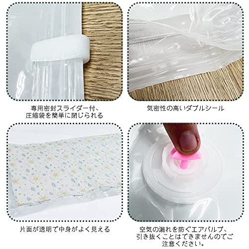【あらゆるシーンに対応】圧縮袋にはさまざまなサイズがあります。 お洋服からキルトまで、あらゆるサイズに対応しています。XLサイズ:120×80cm・・・4枚(布団など) Lサイズ:100×80cm・・・4枚(カーペット、毛布、枕など) Mサイズ:80×60cm・・・4枚(衣類など) (5)手動ポンプ:28×5.5×5.5cm。掃除機が取り出し口で使用可能。