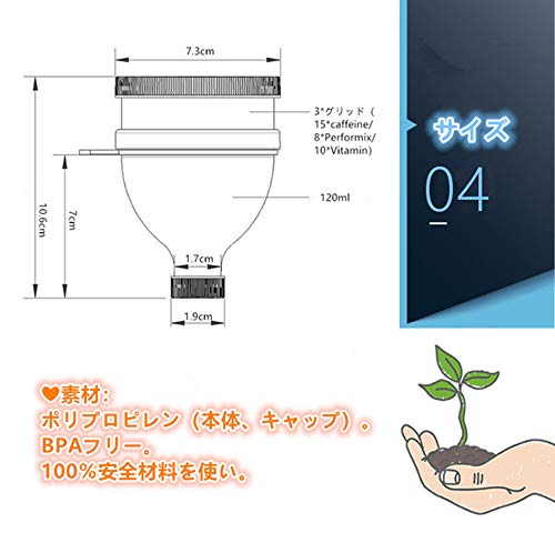 【高実用性携帯ファンネル、薬ケース】:漏斗と持ち運び容器が1つになったサプリメント漏斗(120ml)です。(粉末+錠剤)錠剤の持ち運びにも使えるし、アミノ酸の粉末、プロテインもに持ち運べる。