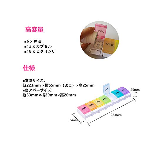 使い勝手:一押し簡単。プッシュオープン。曜日ごと1日1回分収納可能。通勤通学・出張出勤・出国旅行等にも携帯便利です。
