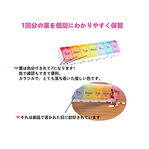 ピルケース 飲み忘れ防止:1週間分のセットができます。曜日が英語で表記されています。半透明で中身が確認しやすく、飲み忘れをなくしたい方へおすすめです。