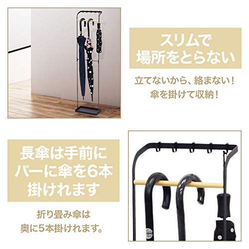 長傘(約90cmまで)6本、折りたたみ傘5本が掛けられます。折りたたみ傘はフックに5本掛けられます。フックは取り外し可能なので中央のバーに取りつけて使用することも可能です。