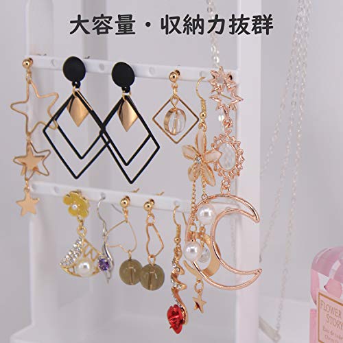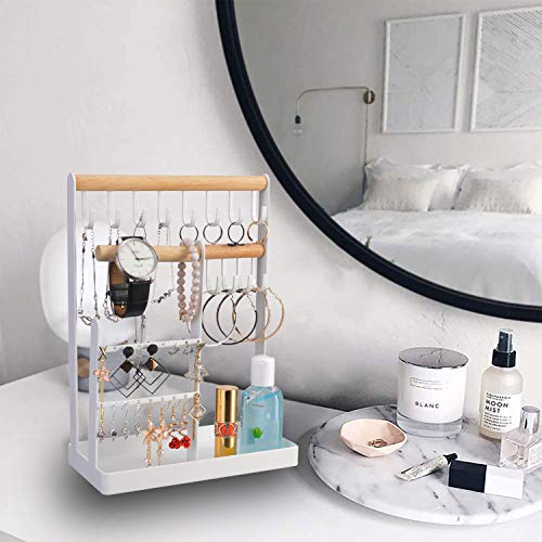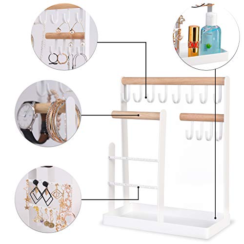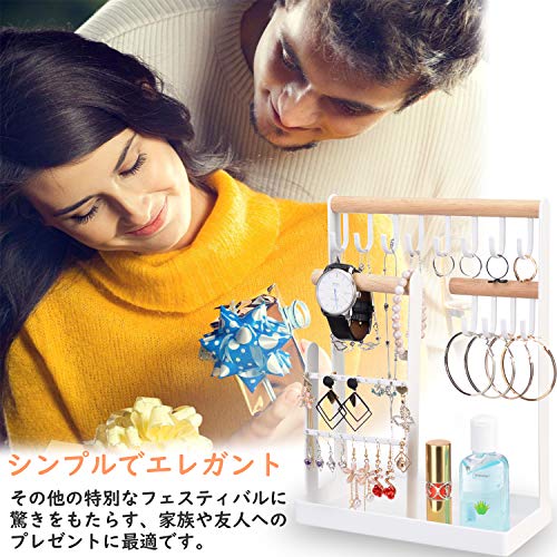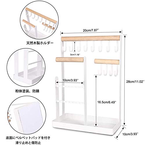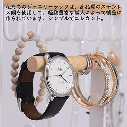 ?【大容量・収納力】多機能ジュエリー収納ラック、大容量設計、優れた収納容量。 12個のフック、18個の穴、2本の木製横棒はネックレス、時計、ブレスレットを収納でき、フックはイヤリング、ネックレス、リングなどを掛けることができます。 下部トレイは、香水、リキッドファンデーション、ヘアアクセサリー、スキンケア製品、口紅などの化粧品を保管するために使用されます。
