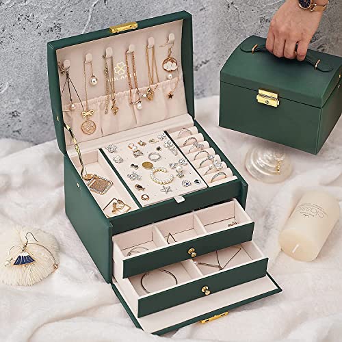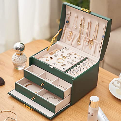 【3層大容量】ジュエリー収納ボックスは3層の取り外し可能なコンパートメントデザインです、トップカバーには6つのネックレスフックがあり、最初のレイヤーには7つのリングスロット、9つのリングボックス(隠しコンパートメント)、36穴のイヤリングカードとコンパートメントがあります; 2番目の引き出しには9つの小さなスロットがあります(必要に応じて引き出しを再配置できます)。3番目のレベルには2つの大きなコンパートメントがあります。