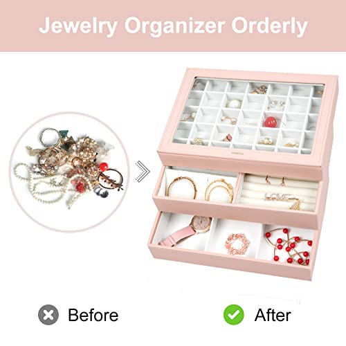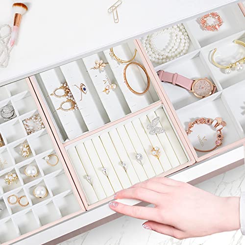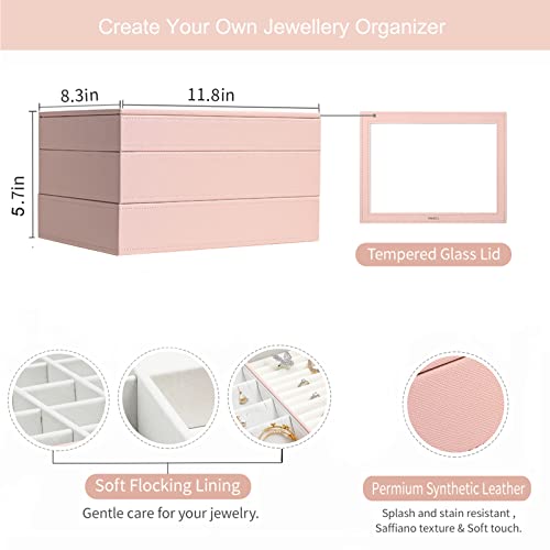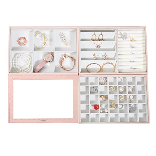 すべてのジュエリー向けに設計:このセットには、35コンパートメントトレイ、リングディスプレイトレイ(1個)、ネックレスイヤリングトレイ(1個)、強化ガラス蓋(1個)が含まれています。イヤリング、リング、ブレスレット、ネックレス、ブローチの収納に最適です。