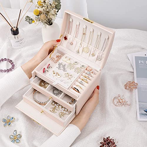 【3層大容量】ジュエリー収納ボックスは3層の取り外し可能なコンパートメントデザインです、トップカバーには6つのネックレスフックがあり、最初のレイヤーには7つのリングスロット、9つのリングボックス(隠しコンパートメント)、36穴のイヤリングカードとコンパートメントがあります; 2番目の引き出しには9つの小さなスロットがあります(必要に応じて引き出しを再配置できます)。3番目のレベルには2つの大きなコンパートメントがあります。