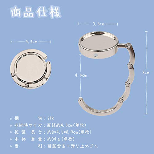【商品仕様】サイズ(収納時):直径4.5cm・厚さ0.9cm。重さ:34g。セット内容:バッグフックX3。