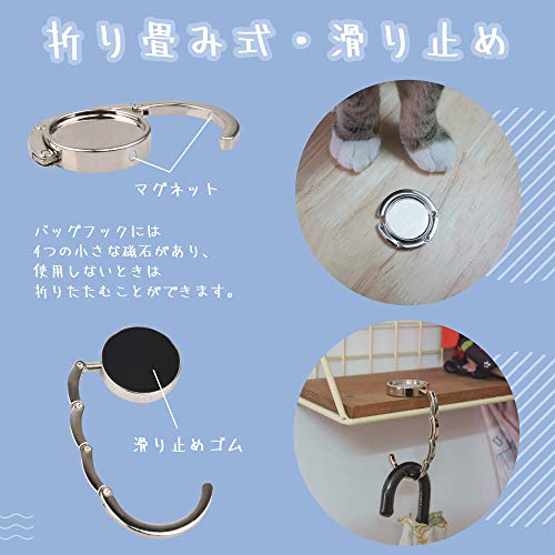 【使い方簡単】フックを広げてテーブルの上に置き、バッグを掛けるだけ~!使用しない時はフック部分は折り畳めるのでスペースが節約できます。