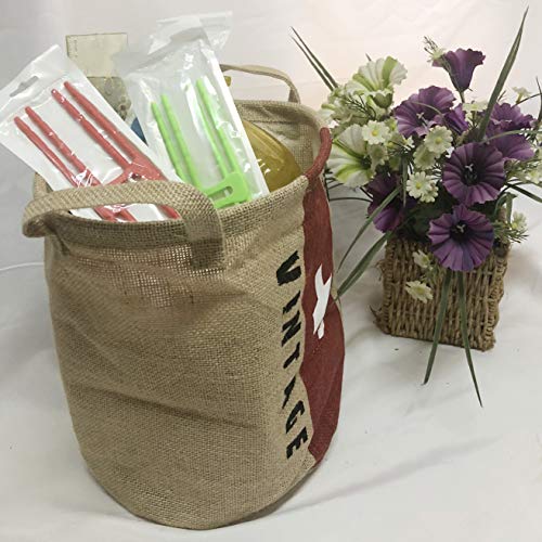 Coralpearl 黄麻布製収納バスケット折りたたみ式ヴィンテージ、ハンドル付きラウンドジュートフードトイバケ