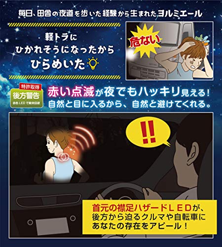 毎日、田舎の夜道を歩いた経験から生まれたヨルミエール。軽トラにひかれそうになったからひらめいた!首元の襟足ハザードLEDが、後方から迫るクルマや自転車にあなたの存在をアピール!赤い点滅が夜でもハッキリ見える!自然と目に入るから、自然と避けてくれる。