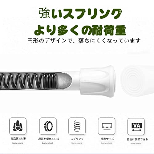 【材料】この突っ張り棒はサビに強い炭素鋼製のパイプを採用します、硬くて軽い、また、棒の中に強力スプリングが内蔵されています。重いものをかけても簡単に落ちてきません。(