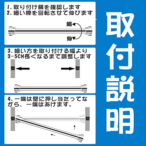 【取り付けが簡単】突っ張り棒の細い方を取り付ける幅より3-5CM長くなるまで調整して、一端は壁に押し当たってながら、一端はあげます。女性一人でも手軽に設置できるのがメリット。掛ける・吊るす・隠す・飾る・・・など、使い分けが簡単にできます
