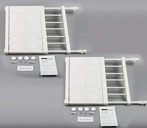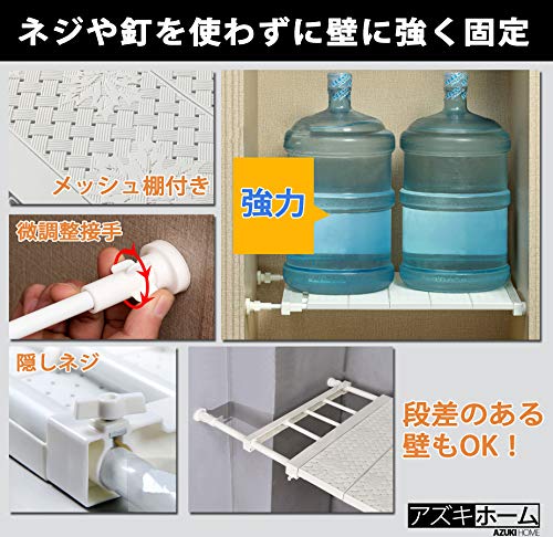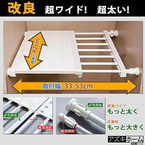 【改良点】小物が置けるフラットな棚板が付いているネジや釘を使わずに壁にしっかり固定できる荷重パイプは13mmから20mmにアップ、耐荷重が倍にする33~53cmで自由に幅を調整できる両側のポールが自由に伸縮するので、段差のある壁にも取り付けられる