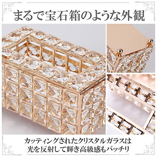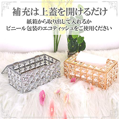 クリスタルガラスはカッティングが施され、光を反射してキラキラ輝くので高級感もバッチリ。シルバーカラーのフレームもデラックス。まるで宝石箱のような外観はどこに置いても映え渡ります。ティッシュの補充も上蓋を開けるだけなので簡単です。