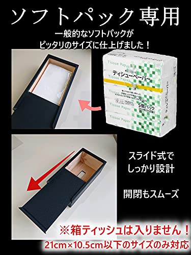 【ソフトパック専用ティッシュケース】トップバリューなどのソフトパックに合わせた設計。「ビニールの袋じゃちょっと…」そんなティッシュの悩みを解決しましょう。スライド式の裏蓋でしっかり保護。入れ方も簡単。スタイリッシュなマットブラックとアンティーク調のウォールナットブラウンをご用意。お部屋の雰囲気に合わせてカラーを選んでください。シンプルで高級感。そんなティッシュケースを目指しました。