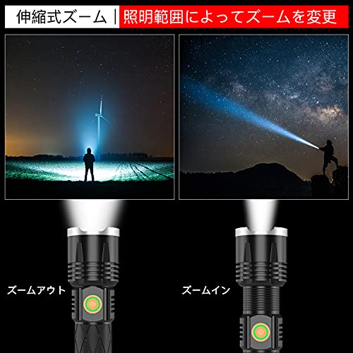 ズーム機能&IPX67防水搭載:ヘッド部分を回転させるだけで、照射距離と照射範囲を連続的に調整できます。照射距離は最大約700メートルです。本製品は水の侵入に対するIPX67の生活防水機能が搭載しており、日常生活での雨水などに防水できます。優レ多耐水性能です。