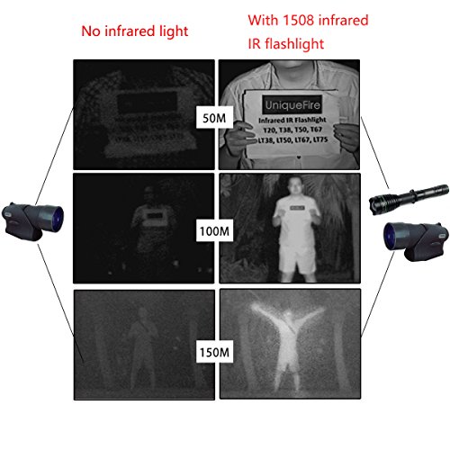 【赤外線LEDライト】UniqueFire UF1508 850nm懐中電灯は、一般的な照明用の白光LED懐中電灯ではありません。 オスラム社製赤外線ライトブラック850nm LED電球を使用して、3wワット程の光パワーで人間や動物の裸眼に見えない高出力IR光を放射します(ライトが点灯していることを示すために、オスラムLEDの小さな赤色の輝きがあります)。暗視機能のある機器の補助に、使用可能ですけど、すべての赤外線カメラと夜間視野スコープが940nmのIR光をピックアップするわけではないことをご注意してください。850nmの光が強く映りが良いです。940nm光が850nmよりも可視光のスペクトルからはるかに離れていて、カメラセンサーがピックアップするのが困難になるからです。 ご購入する前に、使