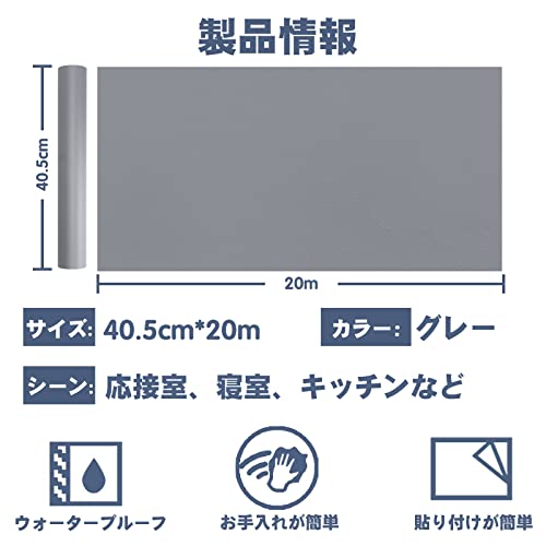 【壁紙シール仕様】幅40.5cm×長20M/巻。面積は8.1m2/巻です。 色:グレー 柄:無地 おしゃれな無地の壁紙シールです。生産ロットにより、色差が出る可能性があるので、一回に多めにご購入するのをおすすめします。
