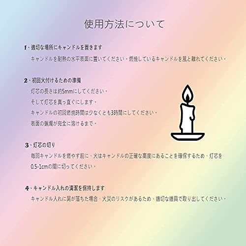 【アロマロウソクのサイズと燃焼時間】8 x 8 x 9 cm、蝋燭重量:103g、使用時間は約30時間です。