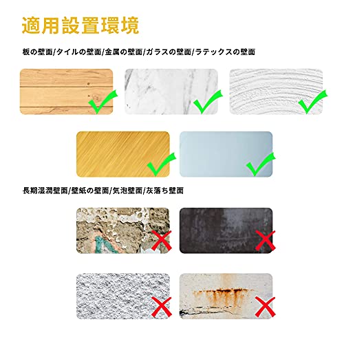 【取付簡単】付属の強力な両面テープを利用して、直接壁に貼り付けることができるので、ひとり暮らしや若い女性でも簡単に設置できます。賃貸の方にとってもちょうどいい、簡単に剥がれて、壁もスッキリ。滑らかな壁、ラテックスの壁、ガラスの壁や木製ドアに設置OK