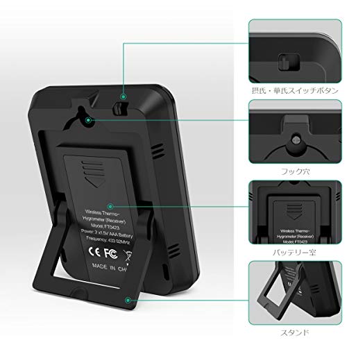 【設置簡単】:子機と親機にも単4電池を2本入れ、親機表示されるまで1分ほどお待ちください。卓上スタンド・壁掛け用フック穴付き、自宅で様々な場所に設置出来ます。取扱説明書は日本語にも対応していて、心配ご無用です。