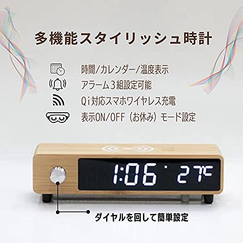 Qi充電時計 デジタル 置き時計 ワイヤレス充電 目覚まし時計 多機能 インテリア時計 卓上 クロック 木目 黒 薄