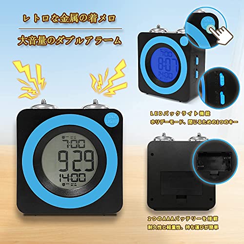 目覚まし時計 大音量 ベル ダブルアラーム スヌーズ 機能 めざまし時計 光 LED カレンダー /年/月/日表示 電池