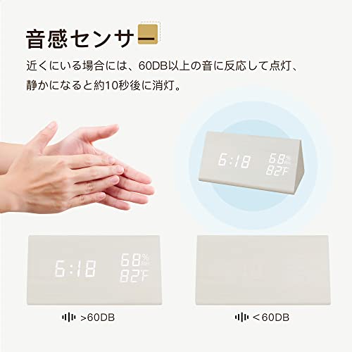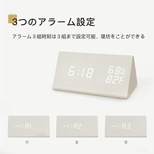 【多機能目覚まし時計】(1)12H/24H時間制数字とけい(2)温度計付き、温度単位選択可(?/[度])(3)湿度計付き(4)アラーム3組設定可能のクロック(平日のみ鳴り5日制アラーム/休日も鳴り7日制アラーム)(5)年月日付(交替的に表示)(6)LED明るさ調整可(自動も手動も調整可)(7)LED画面を閉めて音声制御モード付き(8)エコのUSB充電式(9)乾電池対応(緊急時間の補助機能)(10)メモリ記憶機能あり、7日間ぐらい電源