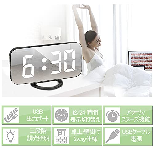 【機能】:時計+目覚まし時計+スヌーズ+ミラー+2USBポート+12時間制/24時間制切り替え可+輝度調節+自動センサー機能