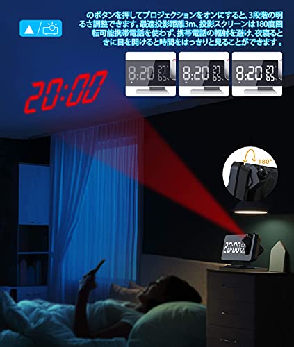 【目覚まし時計】この時計は12時間制/24時間制切り替え可能で、スヌーズ機能を持ち、好きな場所(壁、天井など)に時間を投影できます。頭をあげるだけで時間が確認できます。時間投影の角度が180°に調整することができます。「プロジェクト」ボタンを長押しして、プロジェクションビューを180°上下に反転させます。目覚まし時計には二つの設置方法があります。ブザーまたは FMラジオを使用して、2つ方法で時間を設定できます。時計にはスヌーズボタンがあり、必要に応じ
