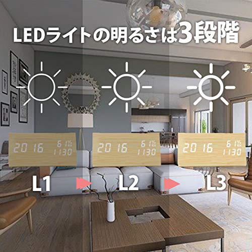 機能はアラームの他、温度湿度計、日付表示、明るさ調節、音感センサーなど多機能です。